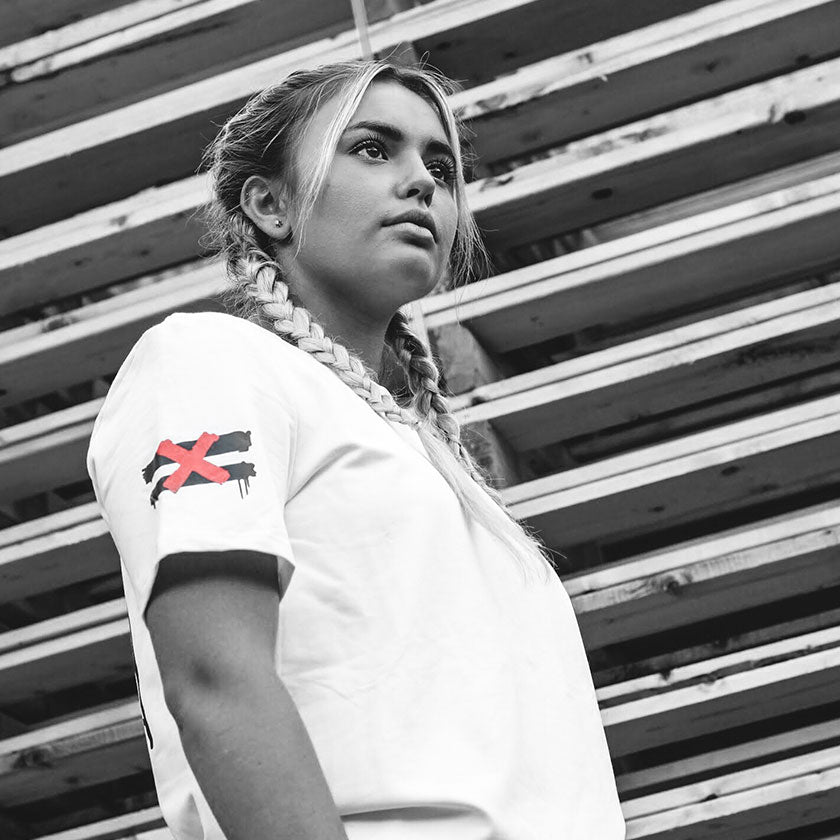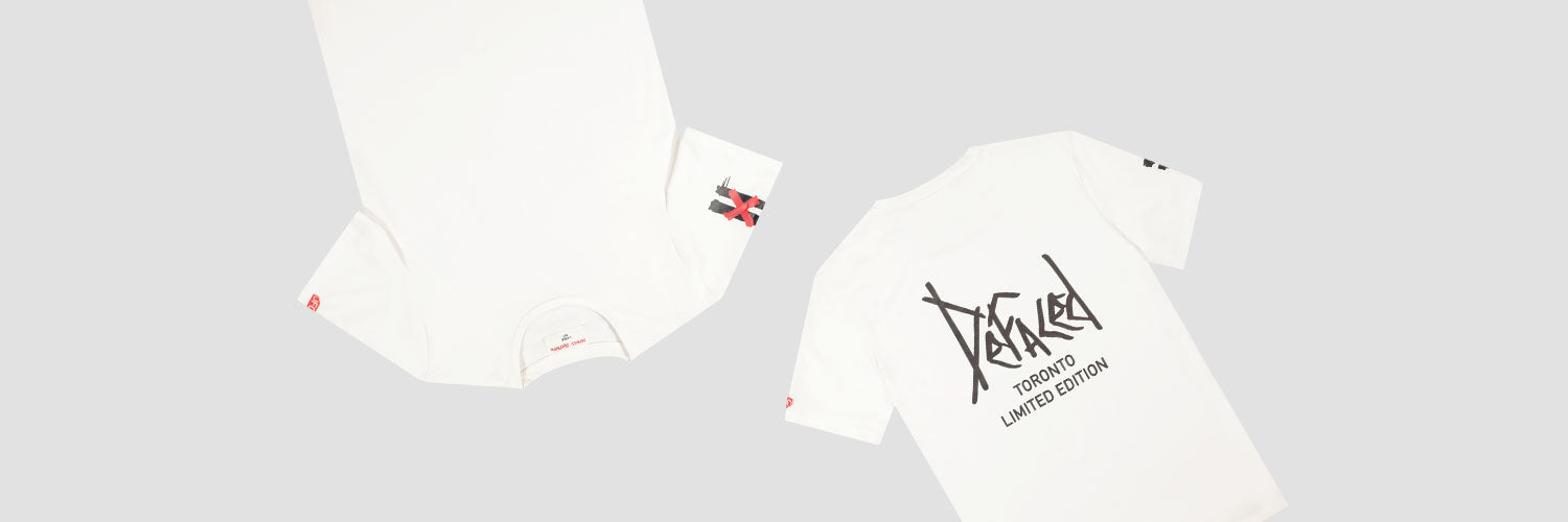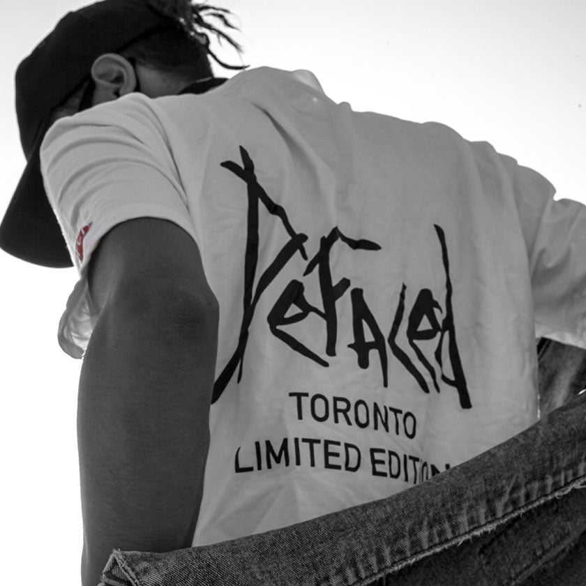 Short sleeve Defaced t-shirt in white. Features a screen-printed defaced spray logo on the right sleeve and a "DFCD" embroidered patch on the right sleeve.